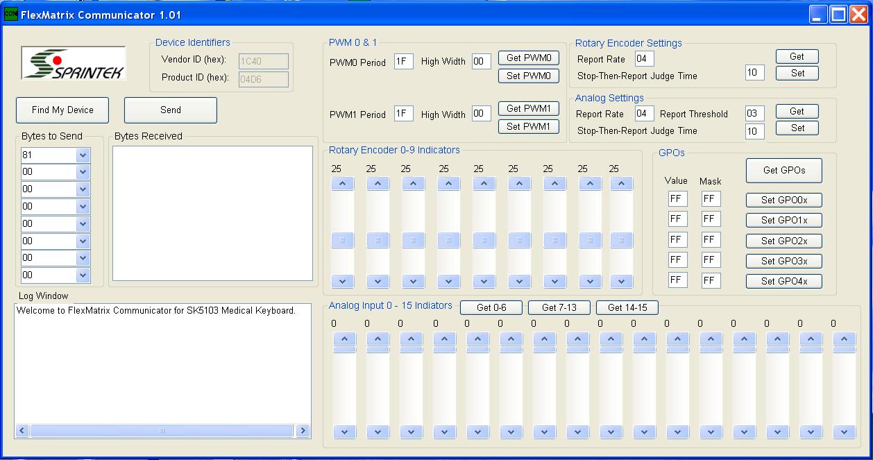 The SK5103 scans and encodes an 8-row by 18-column matrix. The key press events are translated to keyboard and mouse report. The encoder gets matrix information from on-chip flash matrix table. Sprintek provides Windows® application FlexMatrix Editor and Programmer software to edit, download and upload the matrix table.